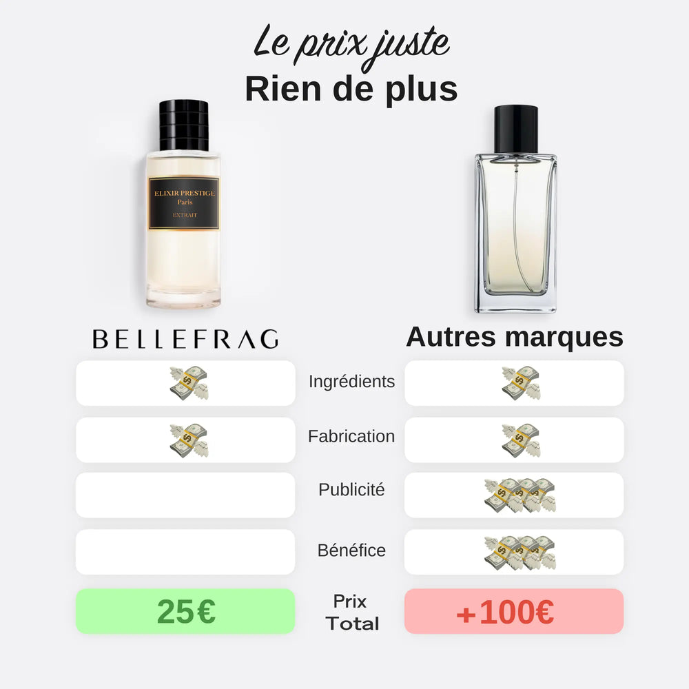 Maison Elixir Prestige redéfinit l'accès au luxe avec un Parfum Sauvage d'exception à 22€, inspiré par Sauvage, qui coûte habituellement 99€. En optimisant emballages et circuits de distribution, nous préservons des ingrédients nobles comme le vétiver ou le bois de cèdre.